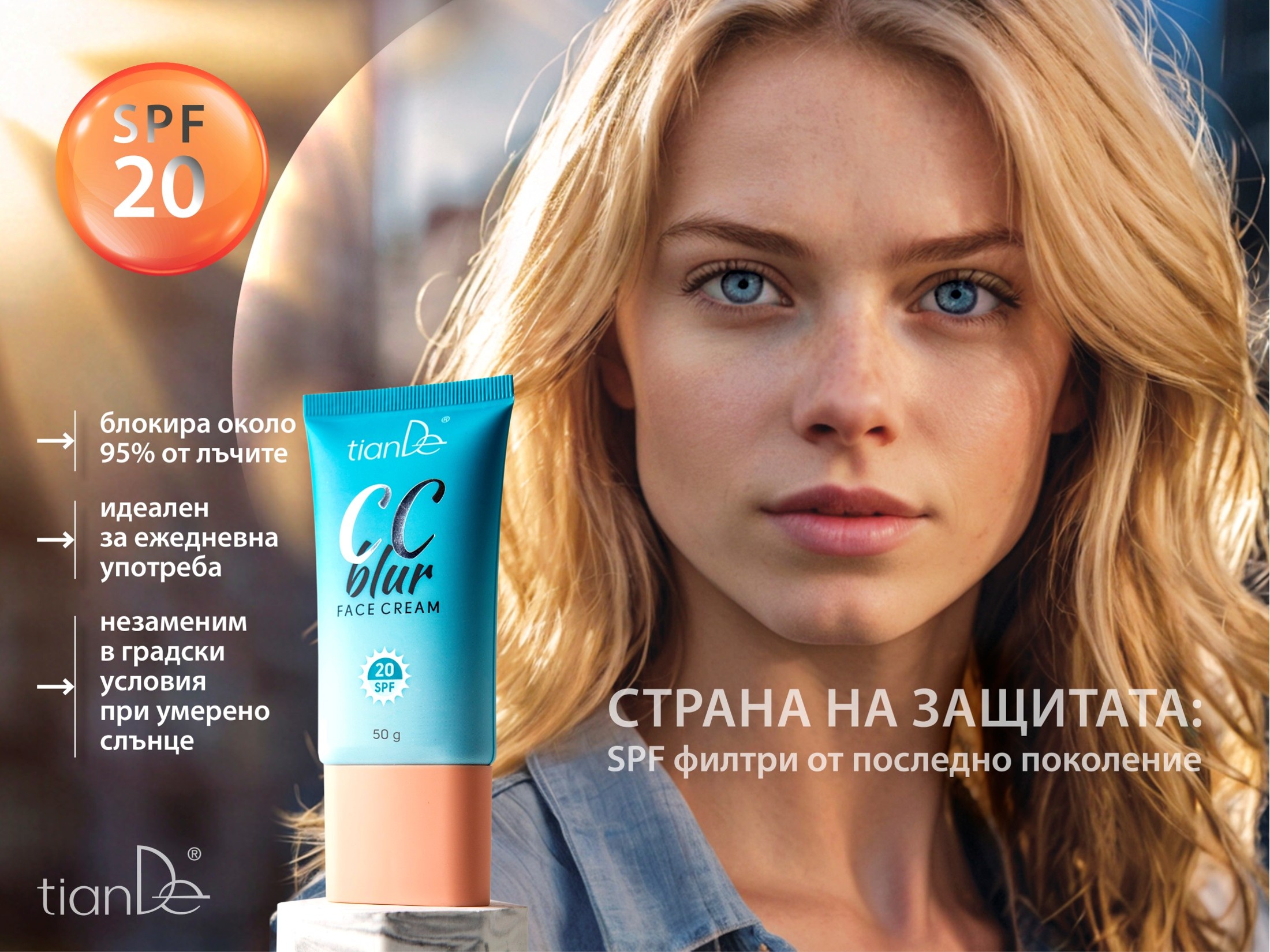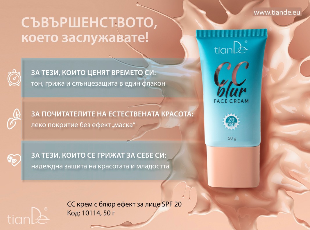 Козметика за грижа на кожата, лек тонален крем, праймер, слънцезащитен крем със SPF 20 за лице – CC крем от ТианДе съчетава в себе си функциите на няколко продукта. Безтегловният хидратиращ крем се адаптира към тона на кожата, коригира цвета и релефа, намалява видимостта на фините бръчките. Маскира порите, придава красив оттенък, матово покритие с естествен блясък.