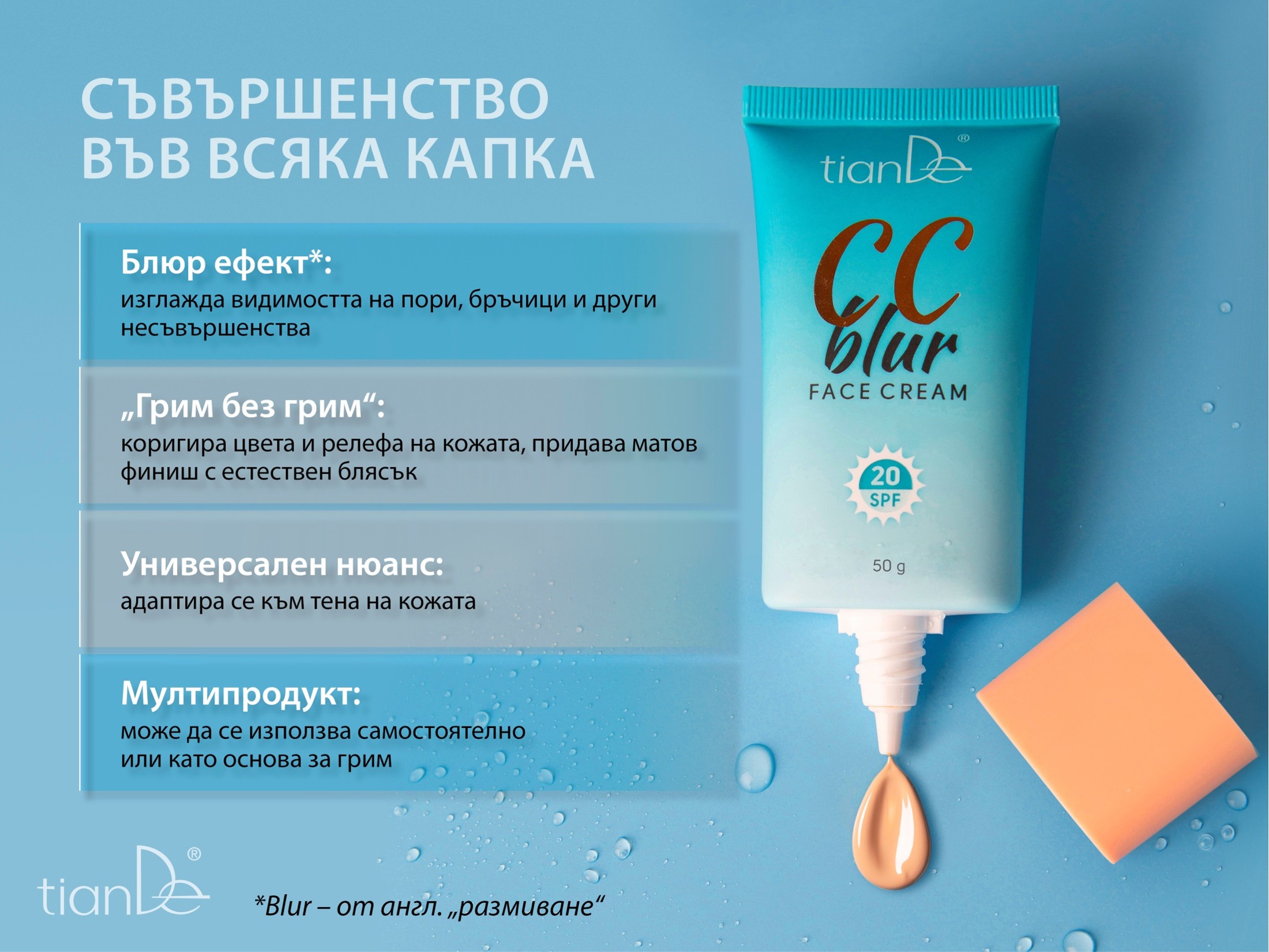 СС крем с блюр ефект от  ТианДе е съвършенство във всяка една капка. Кремът за лице съчетава в себе си качествена грижа, сигурна защита от слънчевите лъчи и изравняване на тона.