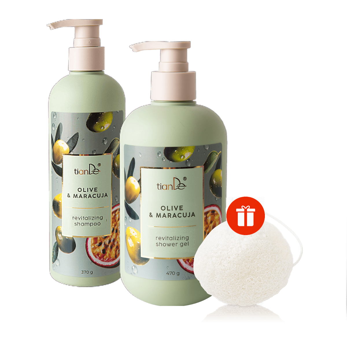 Възстановяваща грижа с маслини и маракуя! Шампоан+душ гел „Маслина и маракуя“- ПОДАРЪК Натурална гъба „Kонняку“.