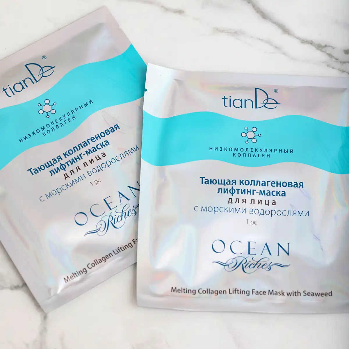 Маската за лице е на основата на нискомолекулен колаген в комбинация с ценни водорасли: